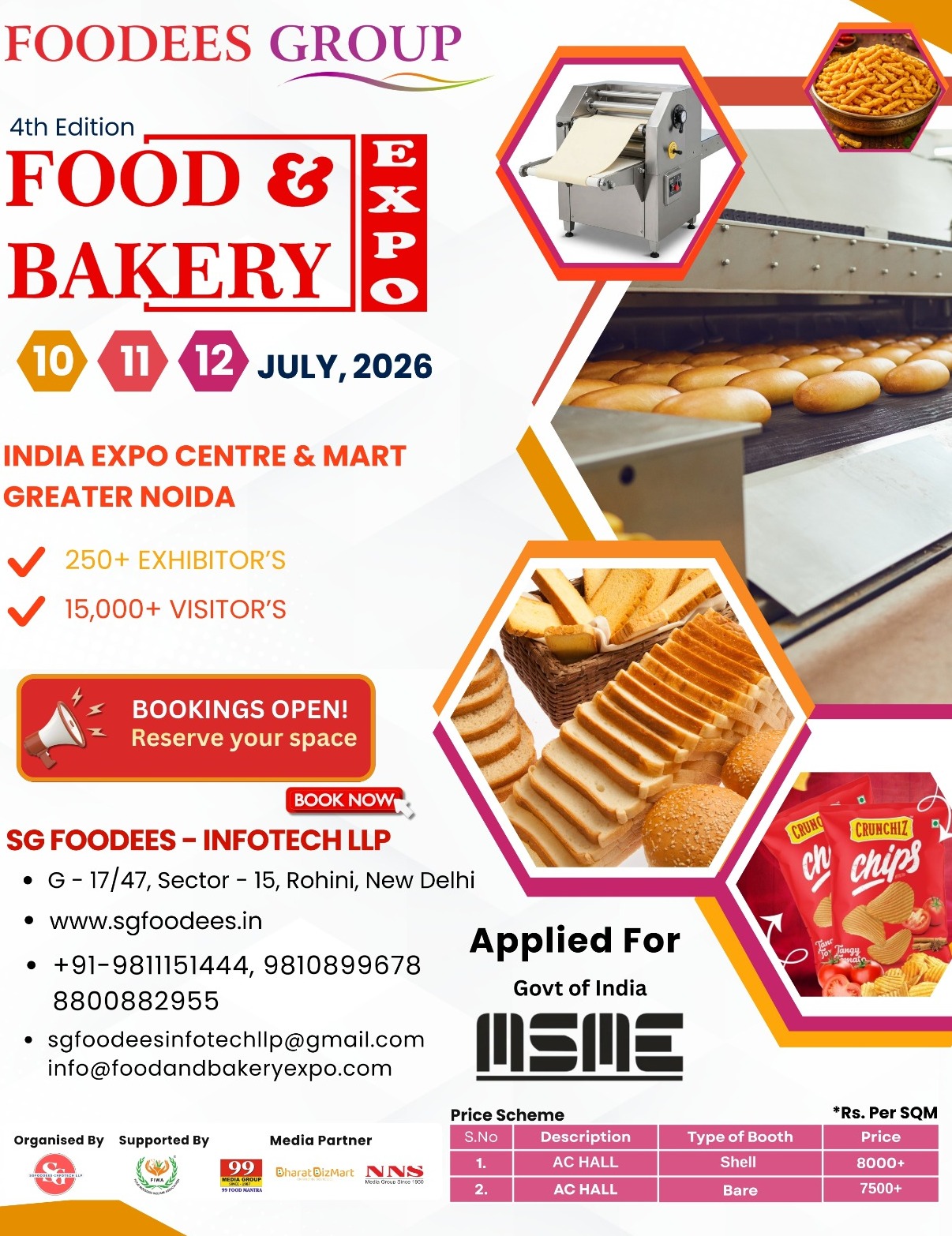 The 4th Edition of the Food & Bakery Expo 2026, organized by SG Foodees Infotech LLP, is set to bring together the finest minds and brands from the food and bakery industry under one roof. This premier exhibition is a powerful platform for entrepreneurs, manufacturers, suppliers, and innovators to showcase their products, discover emerging trends, and build valuable business connections.
